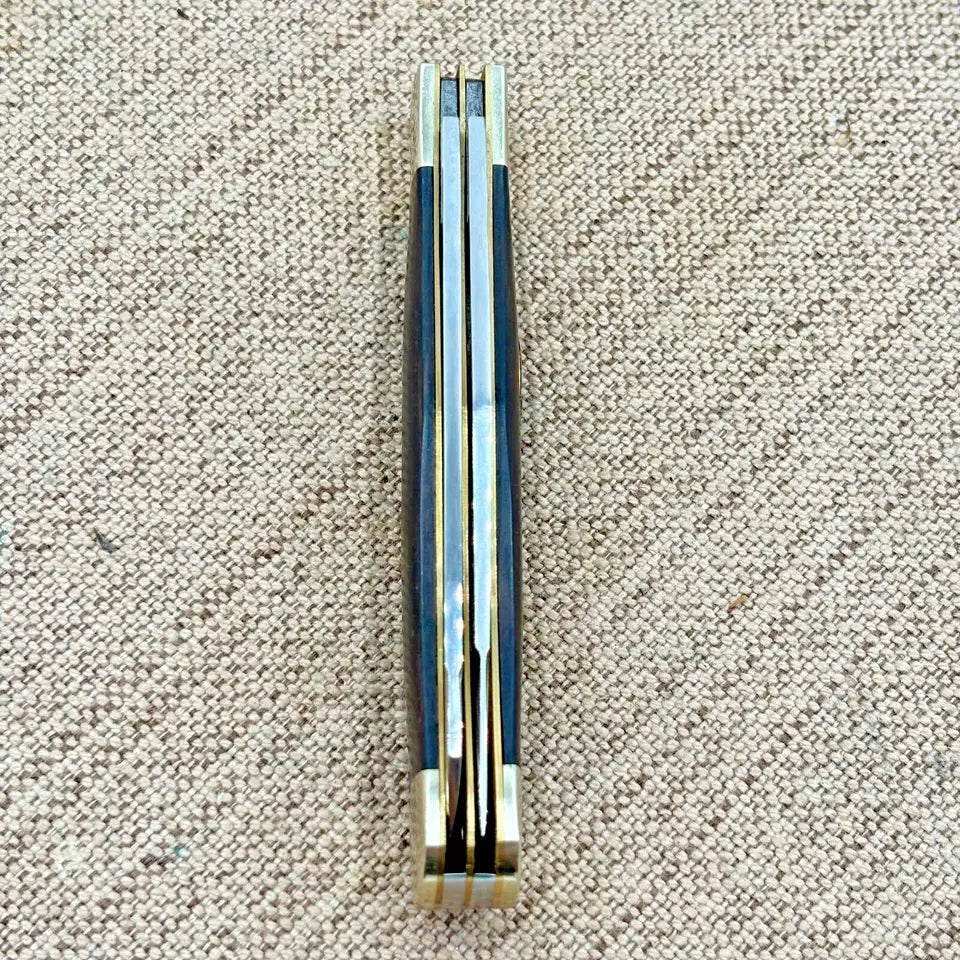 The Buck Creek German Stainless Hand Made Wood Handle Trapper Pocket Knife is a vintage pocketknife crafted in Germany. Featuring a stainless steel blade with a clip point and spey point, this knife has a blade range between 2.76 to 4 inches. It has a slipjoint lock type and a manual opening mechanism, making it suitable for ambidextrous use. The handle is made of wood, giving it a classic and timeless appearance. Perfect for collectors or those seeking a traditional pocketknife with two blades. Measures 4-1/8" closed.