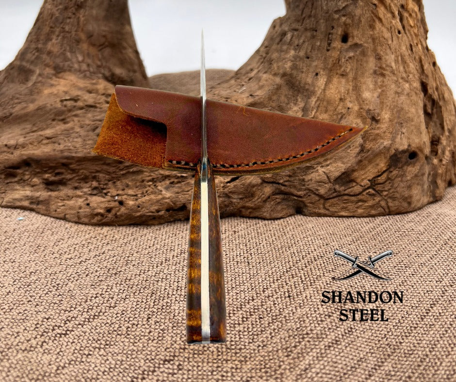 The product is a custom USA hand forged trade hunting skinning frontier patch plains knife with a 3.5" carbon steel blade and a full tang. It is ambidextrous and features a straightback blade edge in a gray color. The knife is handmade by Morning Sun Forge in the United States and comes with a wooden handle and a handmade leather sheath included. This original collectible fixed blade knife is perfect for hunting and skinning purposes, with its durable construction and classic design reflecting the rugged frontier spirit of American craftsmanship. Measures 6" overall.