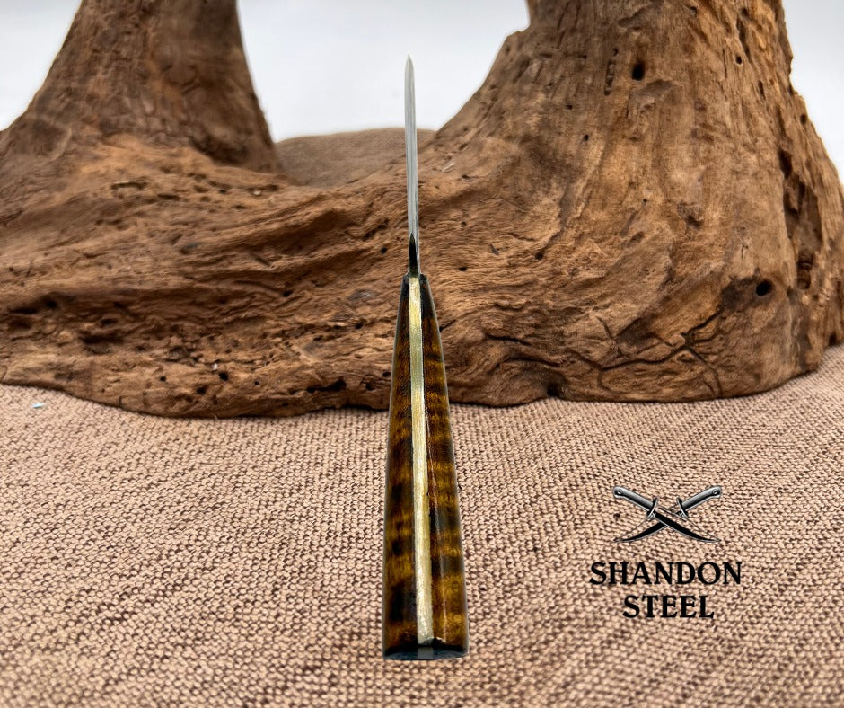 The product is a custom USA hand forged trade hunting skinning frontier patch plains knife with a 3.5" carbon steel blade and a full tang. It is ambidextrous and features a straightback blade edge in a gray color. The knife is handmade by Morning Sun Forge in the United States and comes with a wooden handle and a handmade leather sheath included. This original collectible fixed blade knife is perfect for hunting and skinning purposes, with its durable construction and classic design reflecting the rugged frontier spirit of American craftsmanship. Measures 7.5" overall.