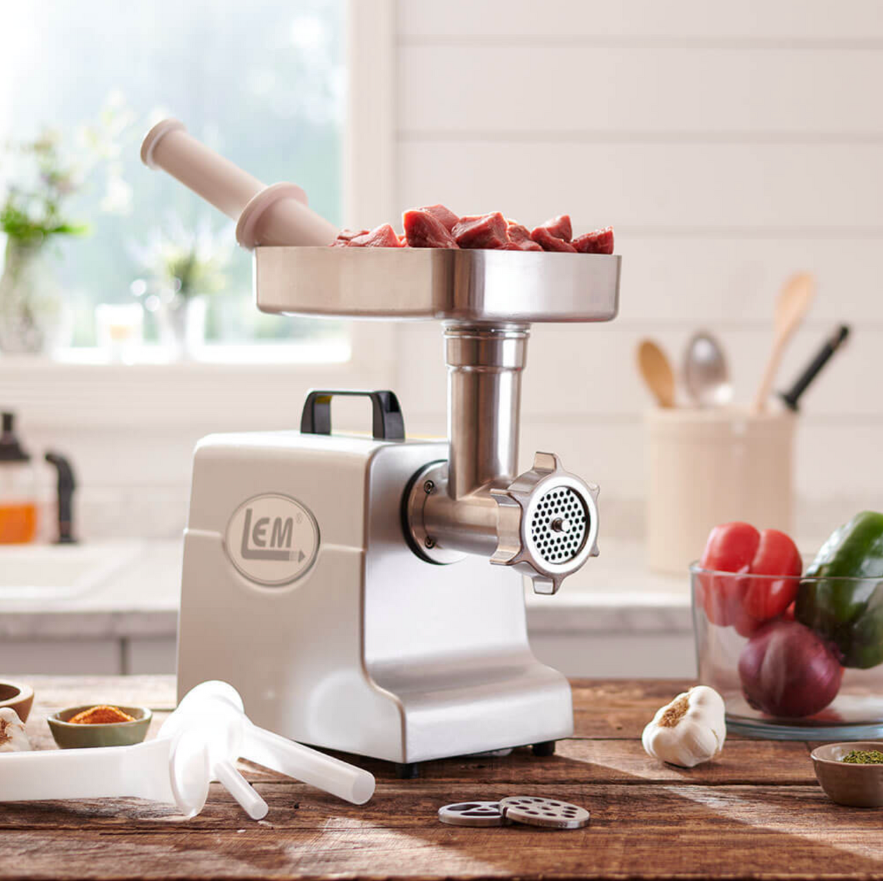 Aluminum motor housing, metal gears, heavy duty handle for easy moving, 120 volt, permanently lubricated motor, built in circuit breaker, stainless steel knife, aluminum head, auger and meat pan 9-7/8" x 7-1/2" x 2" deep, stainless steel coarse (3/8"), fine (3/16") and stuffing plates, 3 stuffing tubes (1/2", 1", 1-3/8" OD), and meat stomper. 2 year factory warranty. LEM 30 day money back guarantee. ETL Approved. Weighs 16.5 pounds.