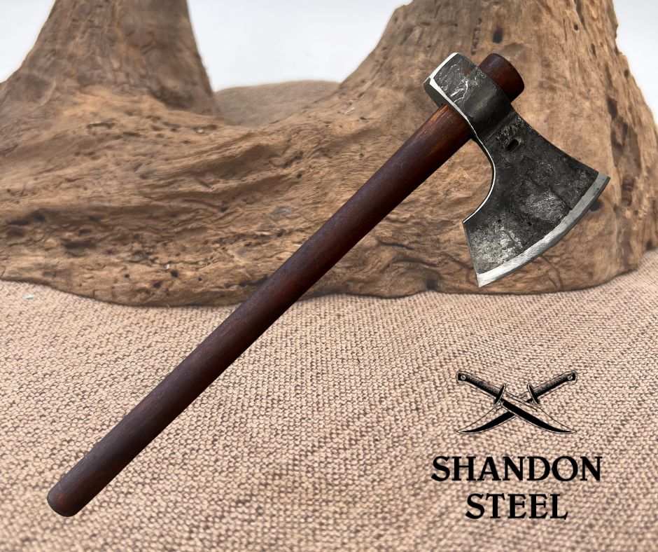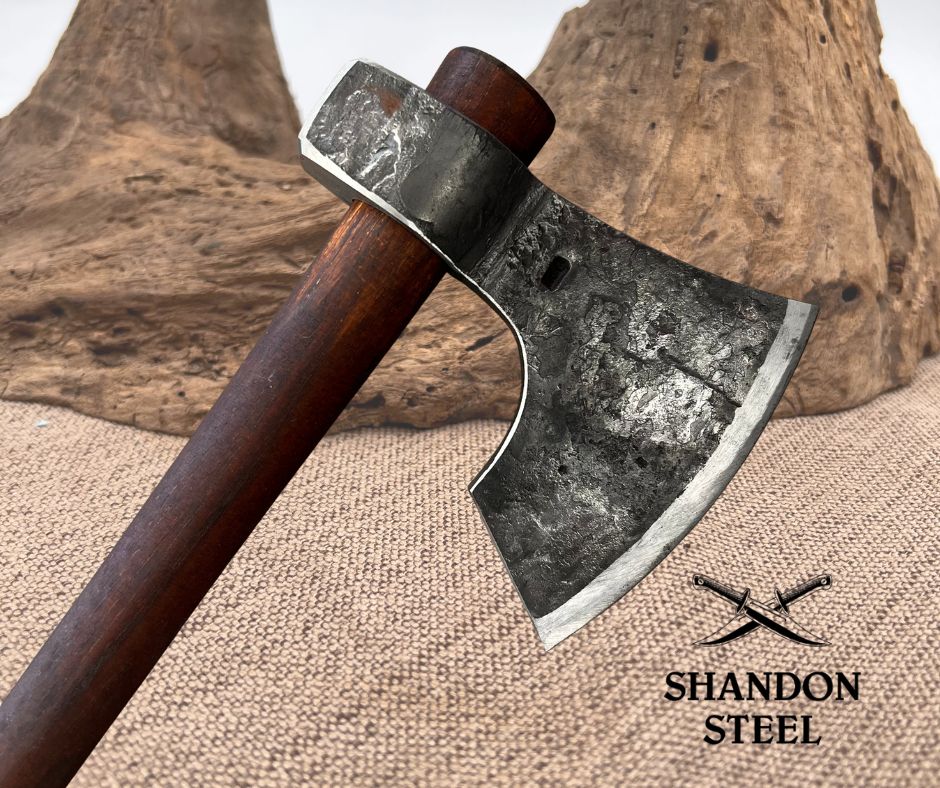A shipwright's tool, the ship builder's axe came in a variety of shapes and sizes. The shape of the blade depended on the function of the axe. The edge of the blade was either straight or curved, most being curved; The angle of the blade also varied depending on whether hard or softer wood was to be cut. A thinner blade was required for the hardest woods. Ours also has a hammer poll as did many of the originals.