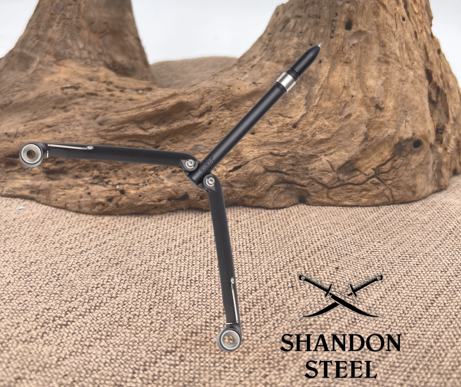 4.25" closed. 7.88" opened with pen in use. Black synthetic construction with angular arms. Unscrew tip to reveal ink pen. Features stainless pivots, rings and clips. All of the refined symmetry and weight ratios allow for great spins, flips and twirls. Blue ink. Includes instruction sheet for basic tricks. Compatible with refills (SCYCNRBL, SCYUSRBL). Hang packaged.