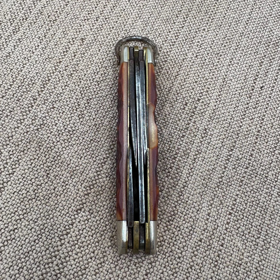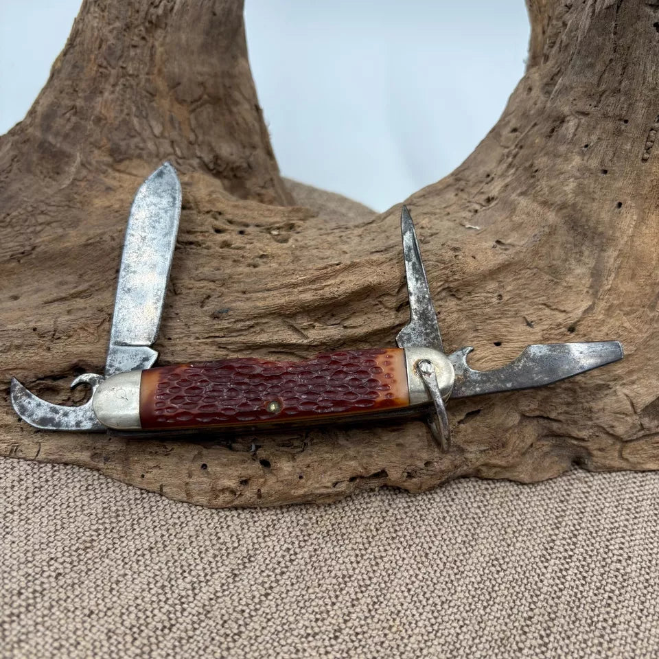 This vintage KA-BAR pocket knife features four carbon steel blades, including a clip point blade under 2.75 inches in length. The knife has a manual opening mechanism with a slipjoint lock and ambidextrous dexterity. The handles are made of jigged Delrin in a brown color, with a bone handle material. This original USA-made knife also includes tools such as a punch, can opener, screwdriver, and bottle opener, making it a versatile and collectible piece for knife enthusiasts. Measures 3-5/8" closed.